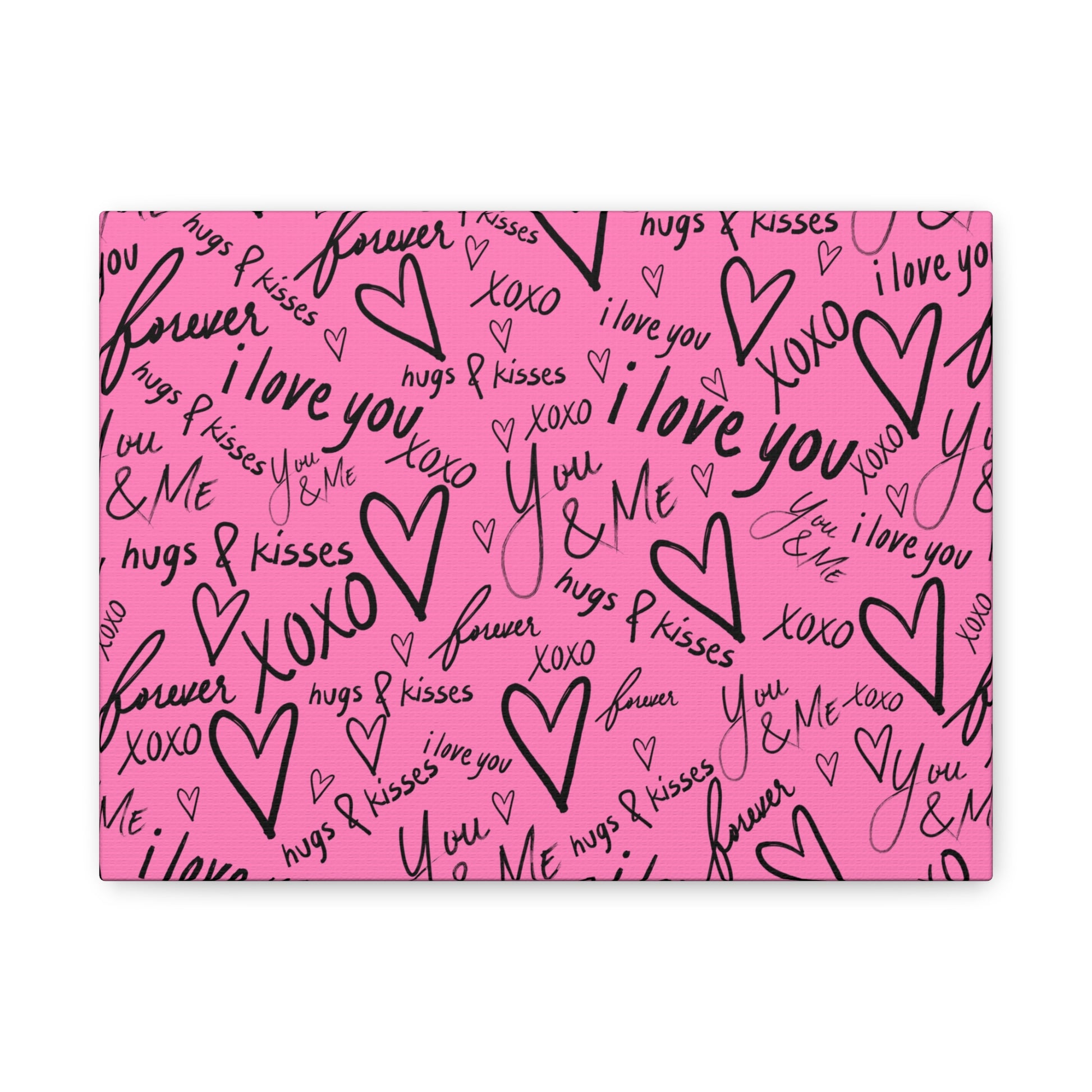 A lively matte canvas print that brings a playful, handwritten love-note vibe into any room. Black hand-drawn hearts and script phrases — “I love you,” “xoxo,” “you & me,” “forever,” “hugs & kisses” — repeat across a vibrant pink field, creating an upbeat, intimate pattern that reads like a wall of affectionate doodles. The image is reproduced with Greenguard Gold UL-certified inks on a durable cotton-poly canvas, stretched over a slim 1.25" radiata pine frame. Soft rubber dots on the back keep it steady on the wall, and mounting hardware is included for easy hanging. The finish is matte, reducing glare and lending a warm, tactile feel that suits cozy spaces and bold decor alike.